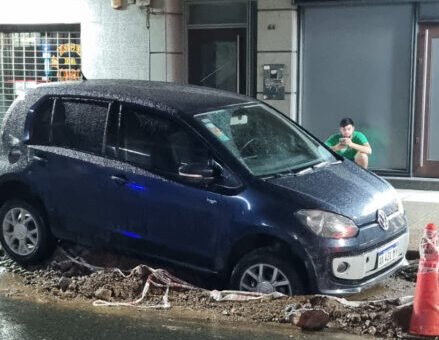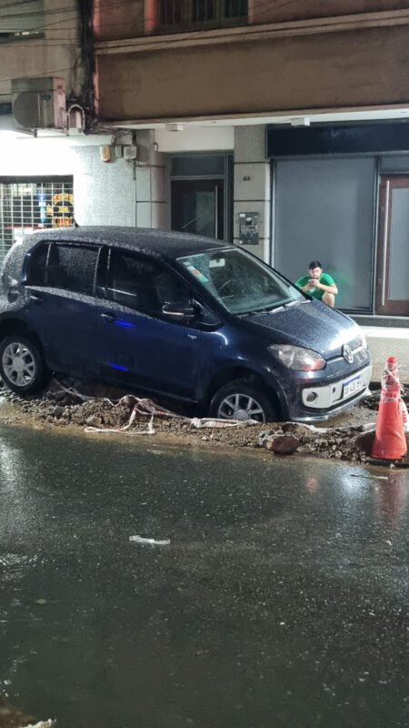 En las fotos enviadas se observa al vehículo detenido con su parte delantera hundida en el pozo, mientras alrededor se aprecia agua en la calzada, material removido y señalización colocada en el lugar. A pesar de ello, el conductor aparentemente no habría sufrido lesiones, aunque el auto quedó atrapado y a la espera de asistencia.