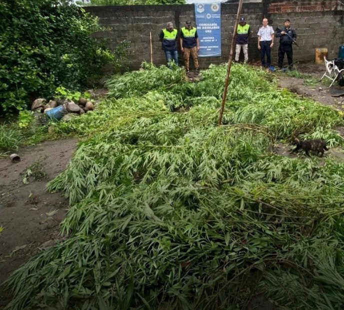 Durante la requisa, los uniformados no hallaron el televisor denunciado, pero sí secuestraron un cartucho de escopeta calibre 12. El hallazgo más relevante se produjo al inspeccionar el fondo del inmueble, donde se detectó una plantación de cannabis de gran tamaño.