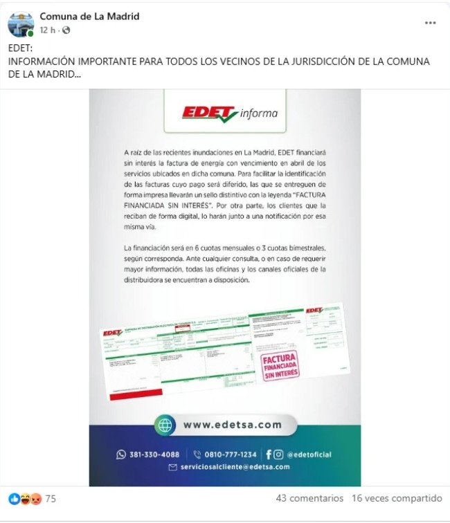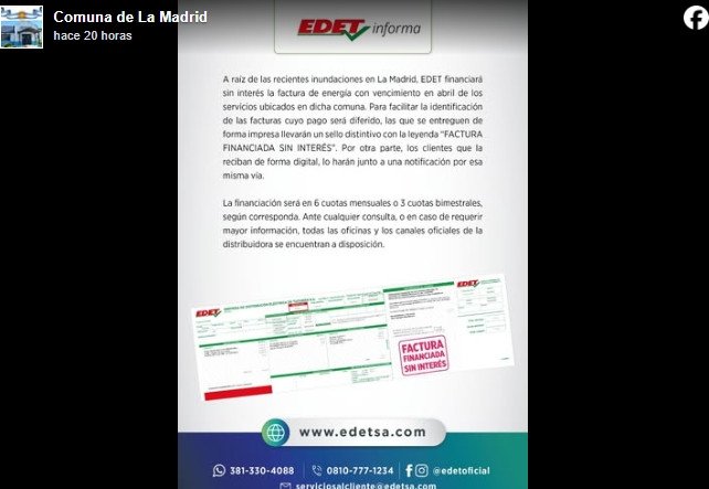 En Tucumán, la capacidad de EDET para la provocación parece no tener techo. Mientras el pueblo de Lamadrid todavía intenta sacar el lodo de las casas y rescatar lo poco que el agua no se llevó, la Comuna de Lamadrid a través de su cuenta ofician de Facebook, replicó un comunicado de EDET, que, lejos de traer alivio, terminó de encender la mecha de la indignación popular: la empresa eléctrica ofrece «facilidades de pago» para los inundados.