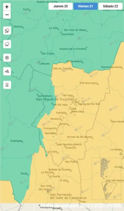 Para el viernes el SMN tiene, en su sistema de alerta temprana, pintado de color amarillo a Tucumán por fuertes vientos. Además, prevé precipitaciones desde la madrugada hasta pasado el mediodía. La temperatura mínima rondaría los 23 °C y la máxima superaría los 31 °C.