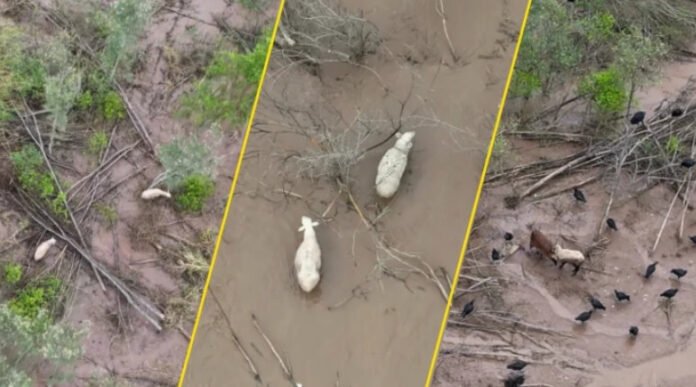 Las imágenes obtenidas mediante drones son contundentes y perturbadoras: grupos de ovejas y cabras permanecen inmóviles, hundidas hasta el lomo en el barro denso, mientras aves rapaces comienzan a atacarlas ante su total incapacidad de defensa.
