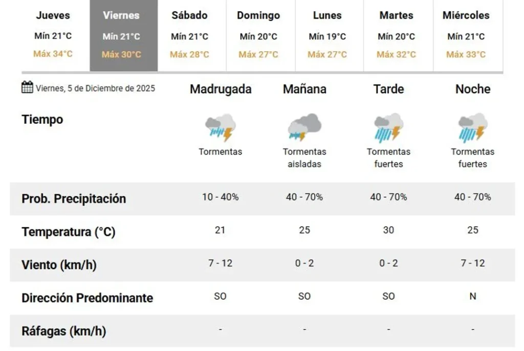 Las mismas podrán estar acompañadas por granizo, frecuente actividad eléctrica, ráfagas de hasta 80 km/h y abundante caída de agua en períodos cortos. Se prevén valores diarios de precipitación acumulada entre 20 y 40 mm, que pueden ser superados en forma puntual.