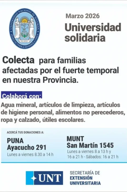 Ante las consecuencias que dejó el fuerte temporal en distintos puntos de la provincia, la Universidad Nacional de Tucumán (UNT) puso en marcha una colecta solidaria destinada a asistir a las familias afectadas.