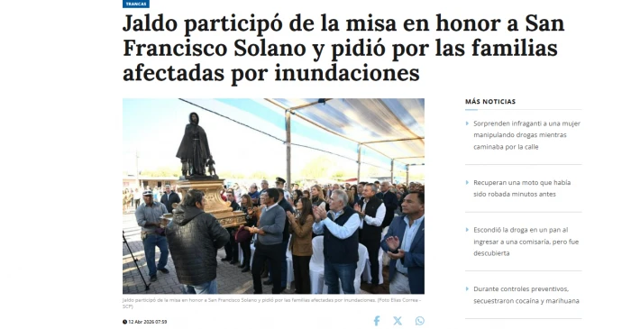 El domingo, el gobernador Osvaldo Jaldo participó de la misa en honor a San Francisco Solano y pidió por las familias afectadas por las inundaciones. Hubo palabras de consuelo y una apelación a la fe frente a la tragedia. La escena fue difundida por el propio aparato de prensa oficial como un gesto de cercanía en medio de la crisis.