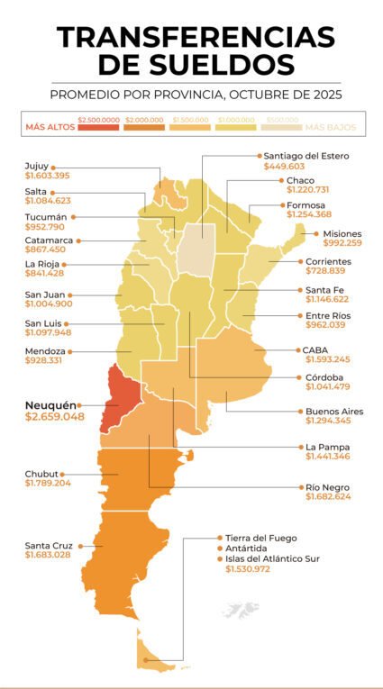 Al observar el detalle por provincias, el informe destaca que Neuquén lidera el ranking de sueldos promedio, con $2.659.048, seguida por Chubut ($1.789.204), Santa Cruz ($1.683.028) y Río Negro ($1.682.624). El peso de la actividad energética y minera, sectores de alta remuneración, se vio reflejado en la cima del ranking.