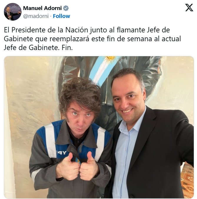 Si bien Milei no ahondó sobre el tema en su discurso, se encargó de darle un espaldarazo público publicando una foto de ambos en la red social X. Fiel a su estilo, Adorni buscó mostrarse relajado y reposteó la imagen con ironía: «El presidente de la Nación junto al flamante jefe de Gabinete que reemplazará este fin de semana al actual jefe de Gabinete. Fin».