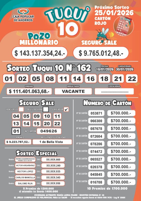Este domingo 18 de enero se realizó el sorteo 162° del Tuqui 10 y el primer premio quedó vacante. Ningún tucumano o tucumana fue el ganador de los $ 111,4 millones que estaban en juego, y el pozo millonario sigue creciendo.