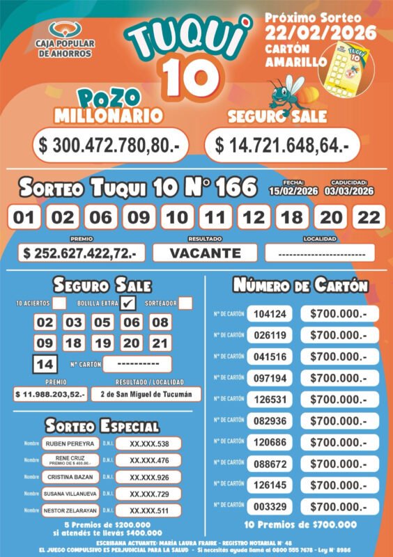 Este sábado 15 de febrero se realizó el sorteo 166° del Tuqui 10 y el primer premio quedó vacante. Ningún tucumano o tucumana fue el ganador de los $ 252.627.422,72 que estaban en juego, y el pozo millonario sigue creciendo.