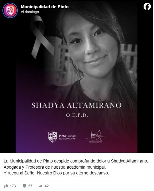 Cuando se conoció el trágico desenlace, fue despedida con dolorosos mensajes. “La Municipalidad de Pinto despide con profundo dolor a Shadya Altamirano, abogada y profesora de nuestra academia municipal. Y ruega al Señor, nuestro Dios, por su eterno descanso”, escribieron en la página oficial del municipio.