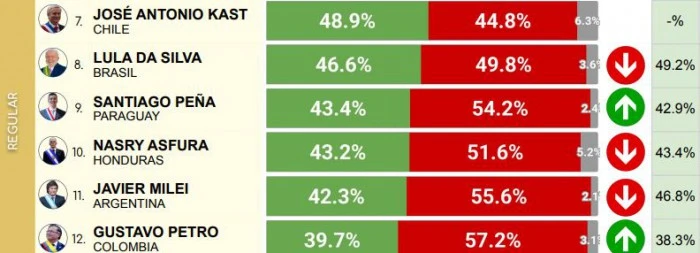 6º Rodrigo Paz (Bolivia): 51,9% (+) / 44,0% (-)