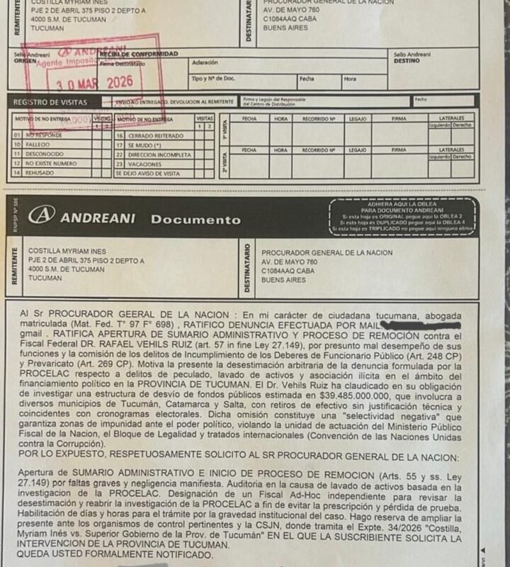 El informe de la PROCELAC desestimado por Vheils Ruiz es parte integrante de las pruebas que fundamentan la denuncia que la Dra. Myriam Costilla efectuó en el marco de la causa, que ahora tramita bajo el expediente 34/2026 ante la Corte Suprema de Justicia de la Nación de pedido de Intervención Federal a la Provincia de Tucumán.