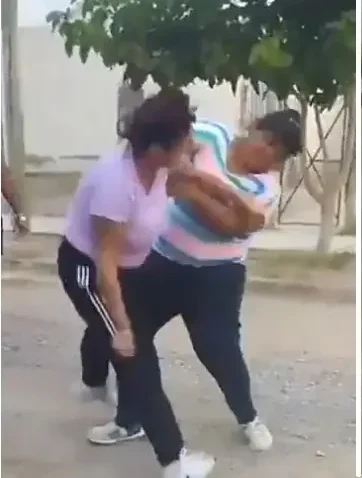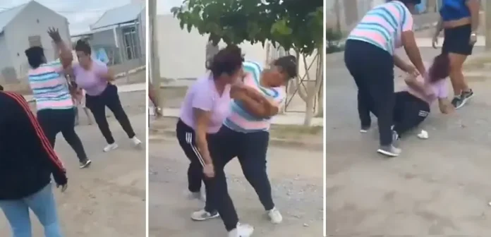 En el video, se observa a dos mujeres protagonizando una feroz pelea en plena calle, mientras otras personas miran y alientan la confrontación.