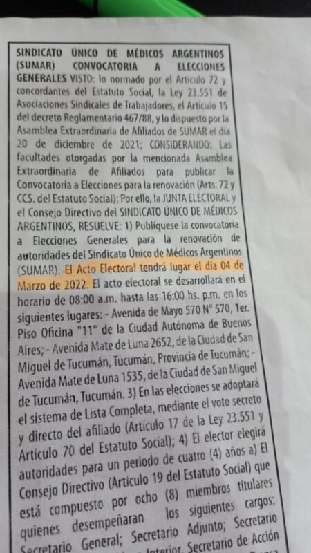 En el matutino Nacional Clarín, se comunicó que el día 04 de marzo del año 2.022 debían haber llamado a elecciones, pero la casta sindical no brinda ningún tipo de información a sus afiliados. Por lo tanto, la comisión directiva en los días de la fecha ya tendría haber llamado a elecciones en la entidad gremial; según sus publicaciones en el diario Clarín.