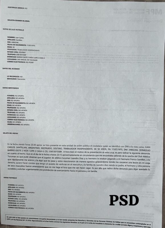 Un hincha de Atlético Tucumán denunció en sede policial al delantero Leandro Díaz por una presunta agresión ocurrida en las inmediaciones del estadio Monumental José Fierro, luego del partido disputado en la noche del martes.