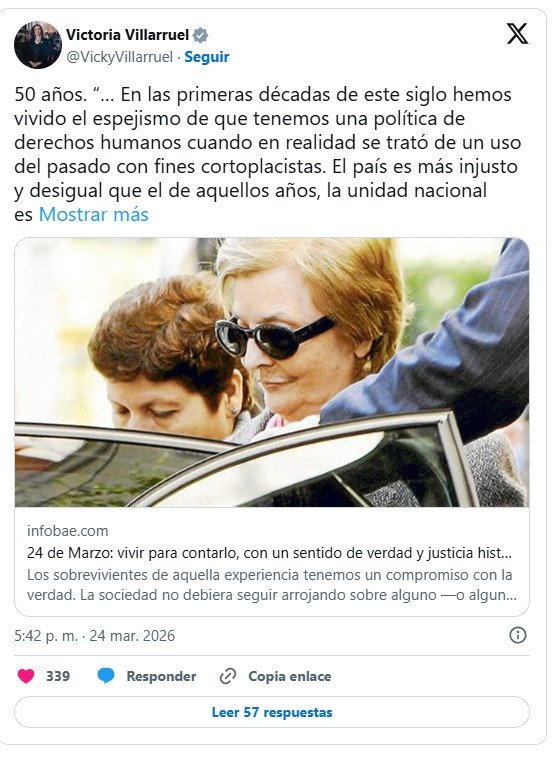 El mensaje de la Vicepresidenta apareció acompañando una nota de opinión de la historiadora Claudia Peiró, reforzando una línea discursiva que Villarruel sostiene desde sus años como activista en el CELTYV. Con esta intervención, el Gobierno marca una diferencia sustancial respecto a las consignas de los organismos de Derechos Humanos que hoy colmaron las calles, instalando la idea de que el pasado doloroso sigue siendo una herramienta de disputa en el presente político argentino.